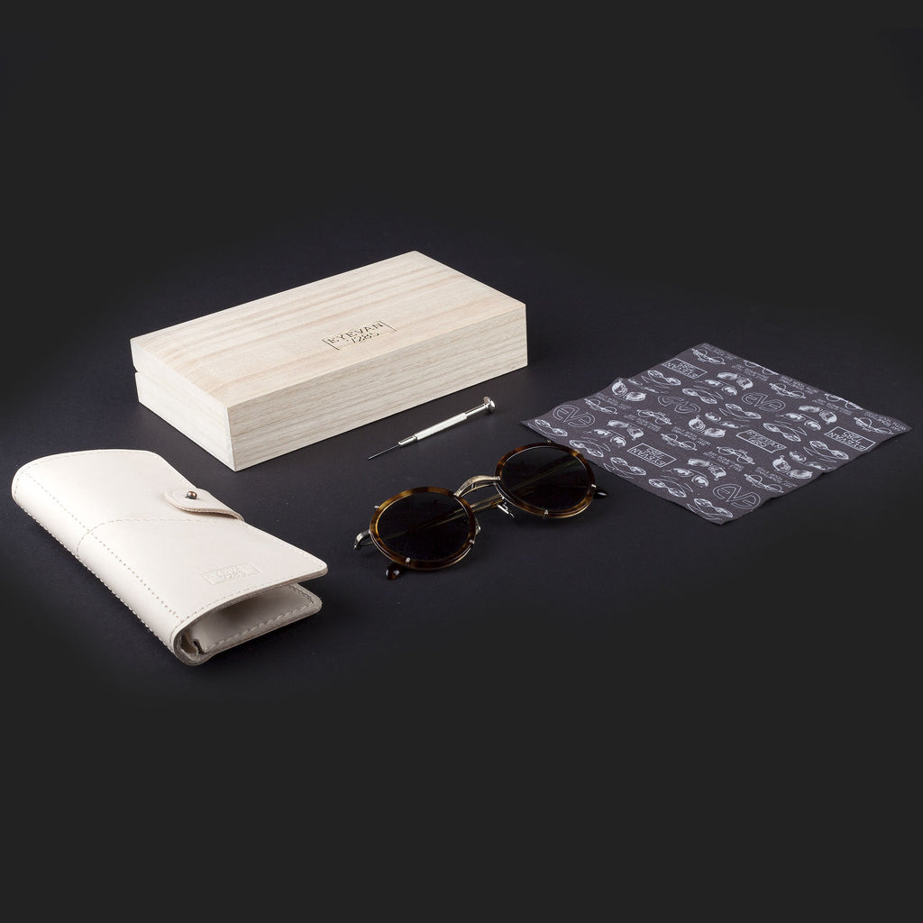 Comes with a special tanned leather case to put the optional lenses and screwdriver in.